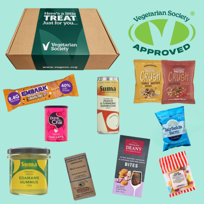 Treat yourself (or surprise someone special) with this Veggie Treat Box bursting with flavour — every item inside proudly carries our Vegetarian Society Approved certification.