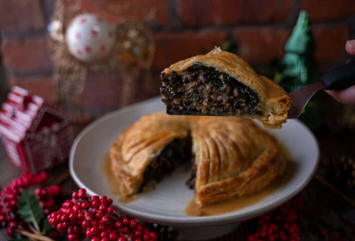 Celebrate the season with this show-stopping vegetarian pithivier, a golden puff pastry dome filled with chestnuts, earthy Puy lentils, and vibrant winter greens. Enhanced with a hint of truffle oil and served alongside a silky Madeira sauce, it’s a hearty, indulgent centrepiece that brings luxury and warmth to your festive table.